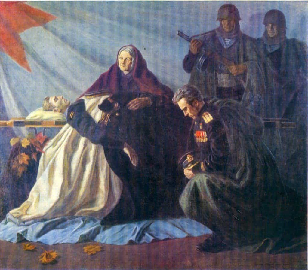 Художник создает картину, опираясь на канонический сюжет положения Христа во гроб. Деревянные носилки, на которых лежит умерший солдат, напоминают крест. Мать, которая склонилась над ним, ассоциируется с оплакивающей своего Сына Богородицей. Вместо участвовавших в погребении учеников Христа, Иосифа и Никодима, — боевые товарищи, которые молчанием чтят память погибшего друга.