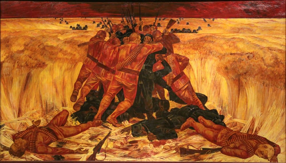 Искусствоведы отмечают ярко выраженные христианские мотивы, которые проявлялись в разных работах на протяжении всего творческого пути художника. Золото колосьев неслучайно находится в цветовом сочетании с образами советских солдат. Очевидна аллюзия на слова Христа: «Если пшеничное зерно, пав в землю, не умрет, то останется одно; а если умрет, то принесет много плода». Теми семенами, которые падают в поле и, умирая, приносят новый урожай, становятся жизни советских солдат. Они жертвуют собой ради последующих поколений.
