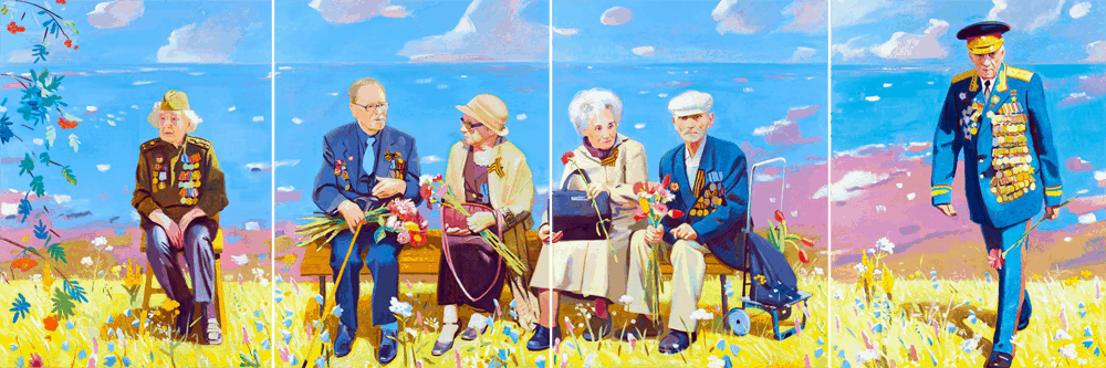 Пейзаж перекликается с темой райского сада: цветущая природа, светлое небо, река, которая, согласно книге Бытие, вытекает из рая и разделяется на четыре рукава. Картина напоминает о том, что победа творилась обычными людьми, которых после войны ждала зрелость и старость, но которые благодаря своим внутренним качествам стали героями, поставив на кон собственные жизни.