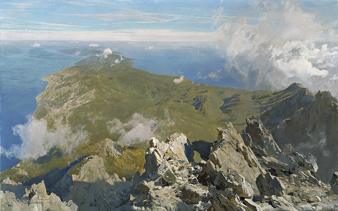 Последние сотни метров пришлось буквально бежать изо всех сил, как суворовским солдатам в атаку, карабкаясь, цепляясь за камни с риском упасть и покалечиться. Это нам, дуракам, было наказание за то, что утром медлили, распивая чай и теряя время. Но когда, выбившись из сил и задыхаясь, мы домчались-таки до вершины, эта стена облаков почему-то остановилась и медленно начала уходить. Будто Господь нас простил. Помню, даже слезы радости потекли. Там, на вершине, мы увидели нечто большее, чем красота: такое умиротворение пришло! Сидим на солнышке, улыбаемся и молчим, завороженные, в изумлении. Ничего прекраснее мы в жизни не видели. Я тогда поклялся написать этот пейзаж по памяти. Пригодились и зарисовки с вершины, и этюды камней, сделанные уже позже, внизу, в предгорьях. На этом полотне я постарался точно передать холмы и заливы полуострова, и нежную голубоватую дымку вдали. Сколько раз я на Афоне потом ни был, не складывалось больше подняться на вершину. Может быть, это и к лучшему. Настолько сильное было впечатление от увиденного в тот первый раз, что сильнее уже невозможно.