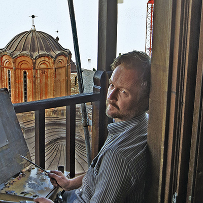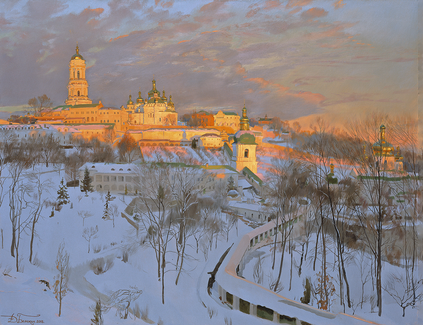 Когда писал эту работу, была зима, не очень морозно, но из-за близости Днепра было ощущение, что на улице минус тридцать пять. Проблема была не только согреться самому, но и согреть краски. Масляные краски тоже мерзнут. Я повсюду рассовал тюбики: во внутренние карманы, за пазуху, чуть ли не у груди, у сердца... Этюды надо было делать ранним утром, чрезвычайно быстро, выкладываясь на полную: буквально через полчаса солнце уже поднималось выше, и уходила трепетность рассветного пейзажа. В один из дней я писал около храма великомученицы Варвары. Стояла пронзительно холодная погода, усиленная жутким ветром. Я, как бездомный, время от времени вламывался погреться в храм, неся с собой и палитру, пытаясь ее отогреть. После третьего моего «набега» какая-то старушка, вероятно нищенка, пожалела меня: «Батюшка, да не ходи ты каждый раз на улицу. Тебе и здесь подадут». Наверное, не увидела мою палитру. Я так растрогался тогда: «Да, бабушка, спаси Господи». Главное, чтобы Господь подал. Наверное, это та радость художника-пейзажиста и художника исторической картины, когда он понимает, что иногда ему Господь все-таки подает, и даже больше, чем он сам ожидал.