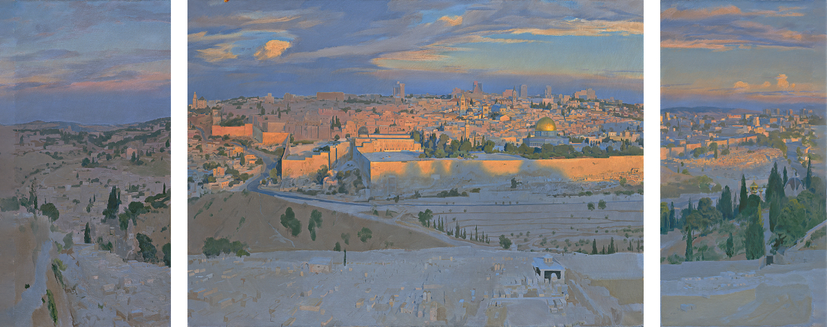 Как художник, к святым местам я отношусь с бережностью, ведь это именно те камни, по которым ходили Спаситель и апостолы. Обычно долго собираю материал, отдельно пишу этюды к дальнему и переднему планам, думаю над композицией, стараюсь не допускать художественного произвола, изменения пейзажа, держа в голове, что эти картины — возможность для верующих, которые не могут cюда доехать, увидеть эти места. На картине довольно известный вид Иерусалима со смотровой площадки на Елеонской горе, охватывающий долину Кедрона, Старый город и боковую часть Елеонской горы с монастырем Марии Магдалины. При рассматривании этого вида вживую (или съемки) взгляд (камера) движется слева направо, отхватывая более 250 градусов. Понятно, что писать такой длинный холст невозможно, и поэтому пишут только Старый город, что лишает этот пейзаж грандиозности и историчности. Как выйти из положения, я ломал голову около трех лет, а потом пришло решение: пейзаж-триптих крупного формата, где в каждой его части показан самый выигрышный и живописный кусок, и расположение при экспонировании его так, чтобы просветы между частями были на определенном расстоянии, давая возможность зрителю почувствовать панораму в целом.