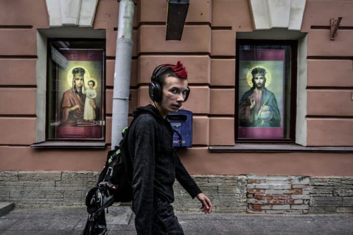 Проходя как-то мимо этого магазина на ул. Восстания в Санкт-Петербурге, я обратил внимание на необычной оформление витрин, сделанное в виде икон... Это смотрелось как своеобразный задник для какой-то уличной мизансцены, которая могла бы случиться здесь. Пока я стоял и размышлял об этом, откуда не возьмись, как по заказу, появился этот прохожий парень, и мне осталось только успеть запечатлеть этот неожиданный контрапункт.