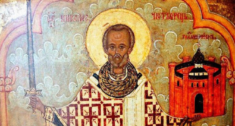 Традиционно святителя Николая Мирликийского изображали с благословляющей правой рукой и с Евангелием в левой.