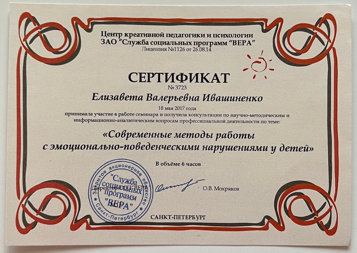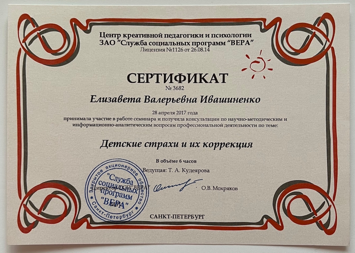 Сертификат службы социальных программ Вера. Детские страхи и их коррекция, 2017