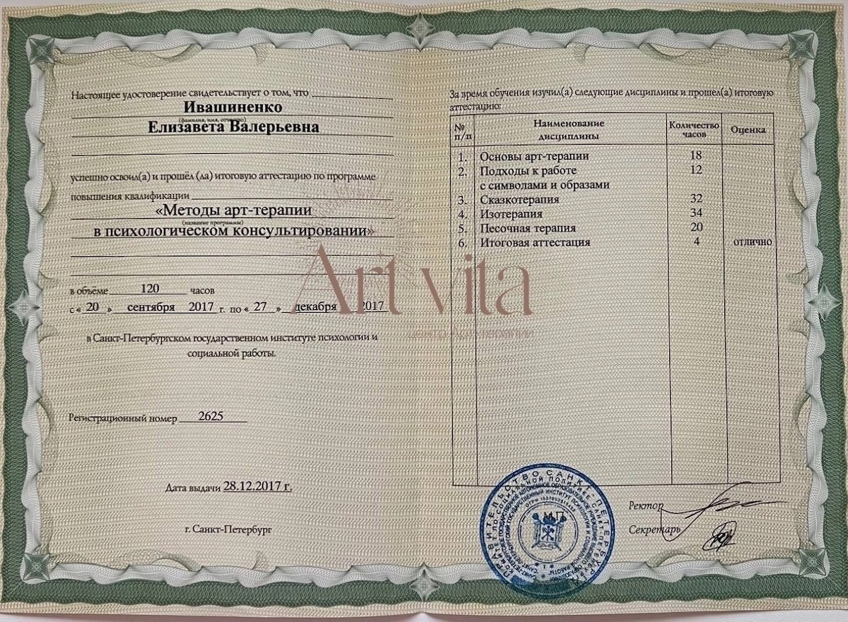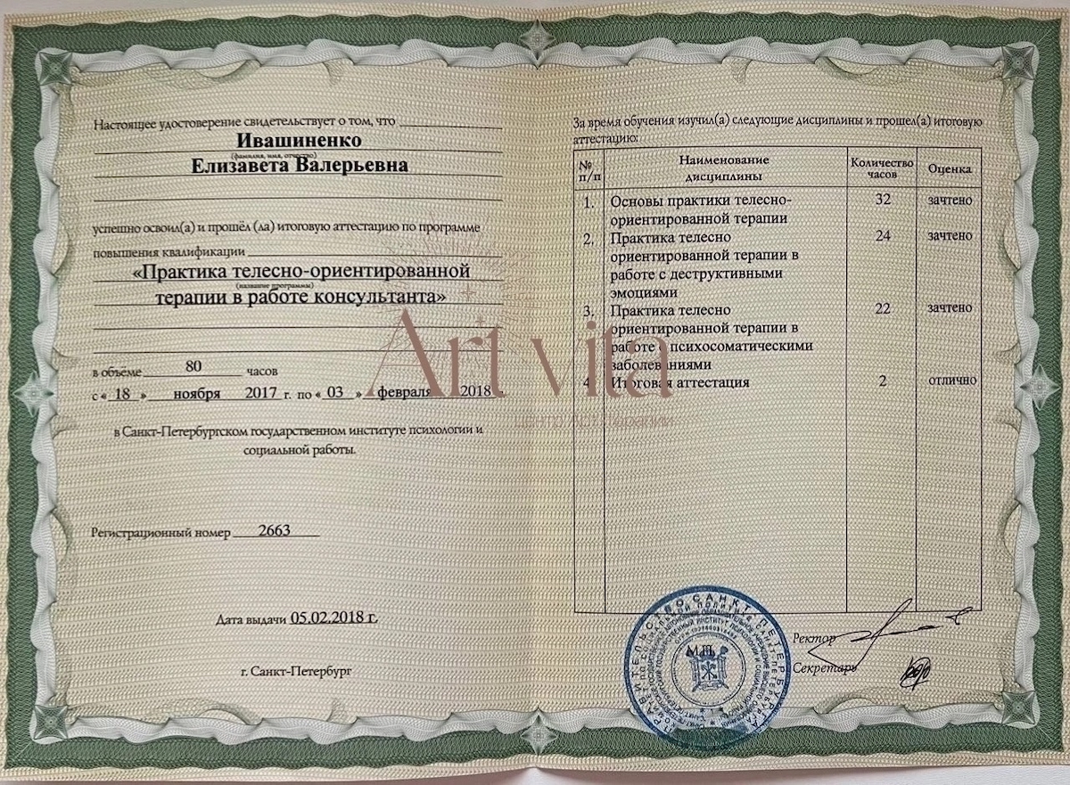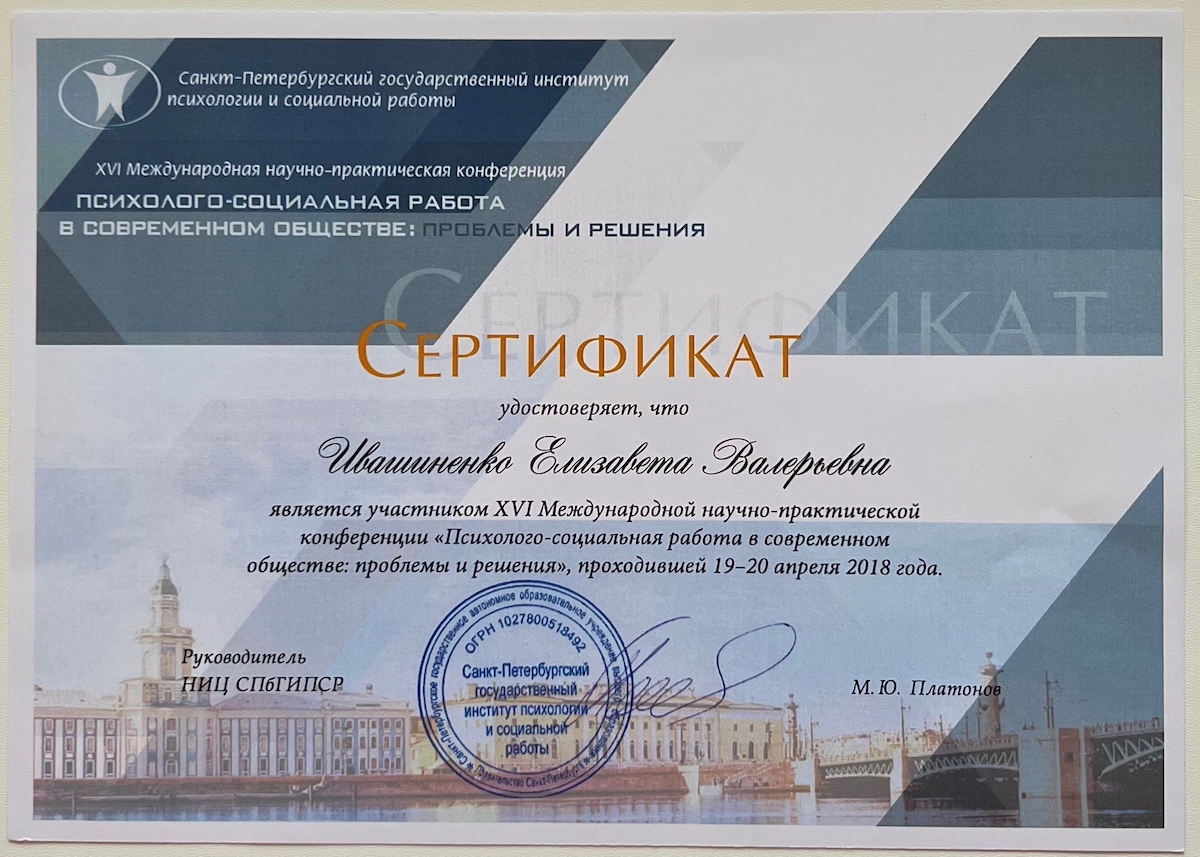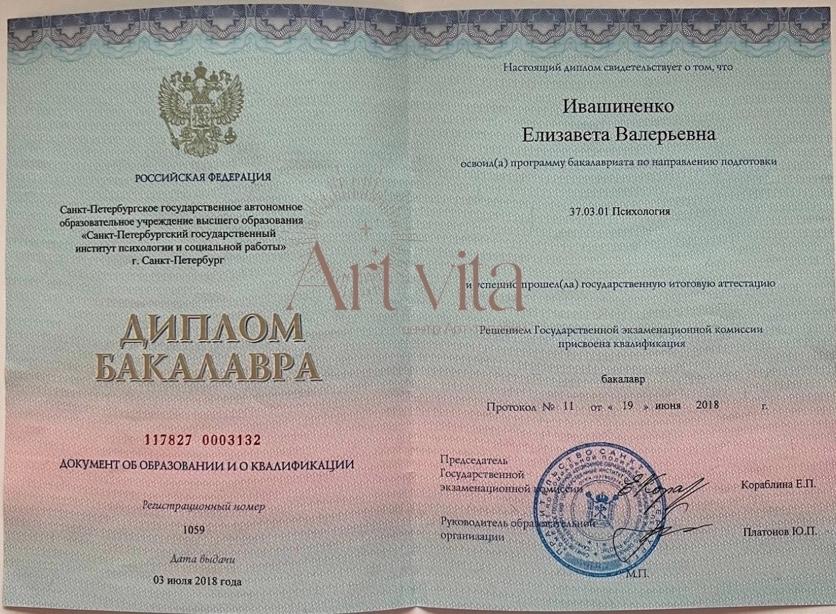 Диплом бакалавра по специальности Психология, 2018. Санкт-Петербургского государственного института психологии и социальной работы.
