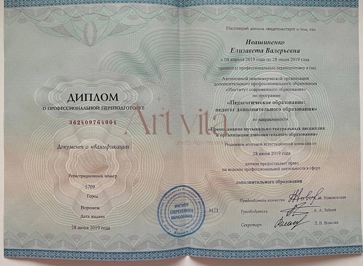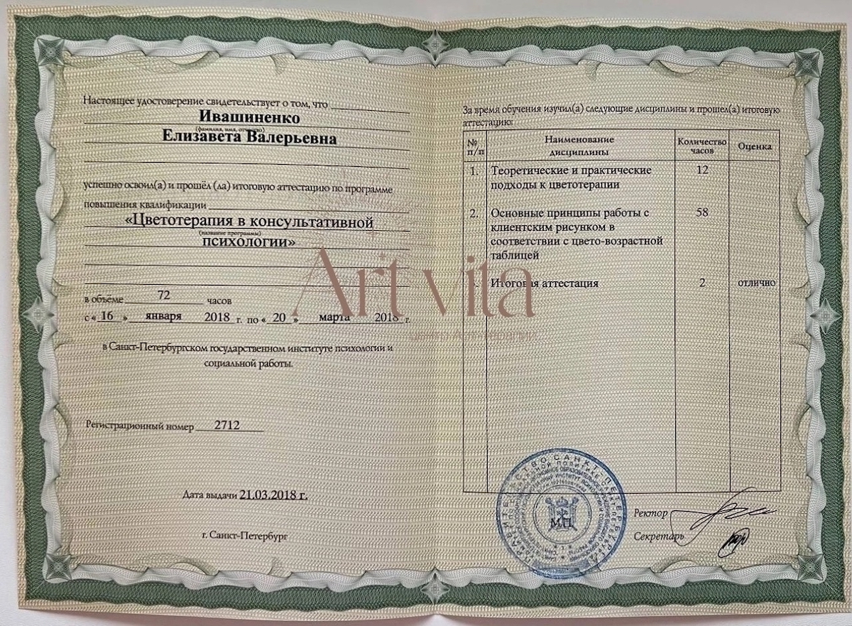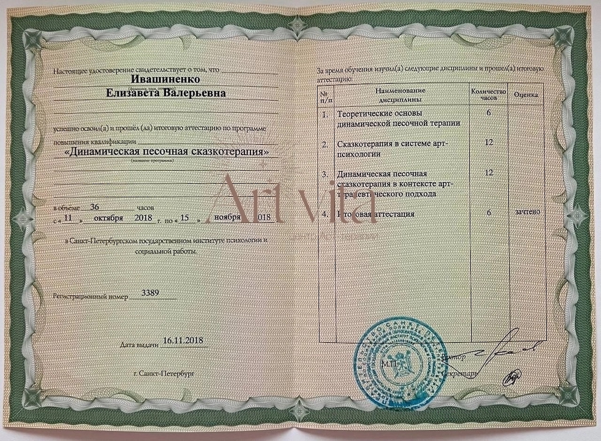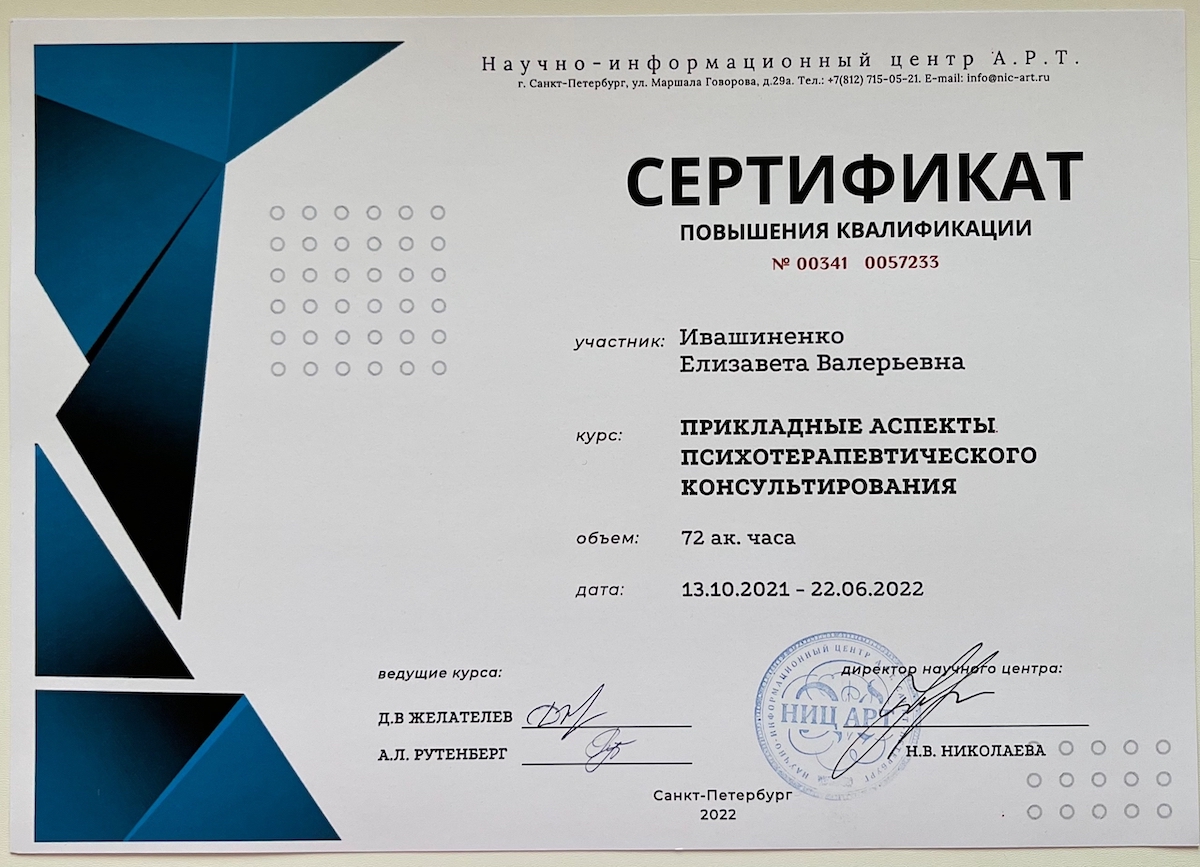 Диплом бакалавра по специальности Психология, 2018. Санкт-Петербургского государственного института психологии и социальной работы.