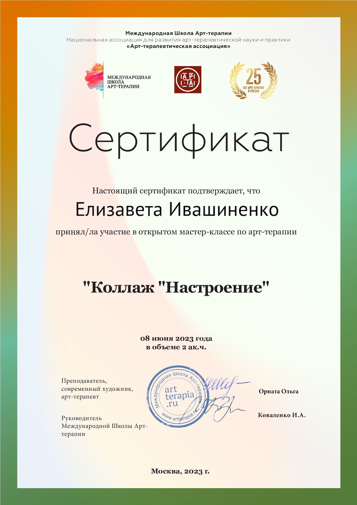 Сертификат Международной школы арт-терапии. Мастер-класс Коллаж Настроение. 2023