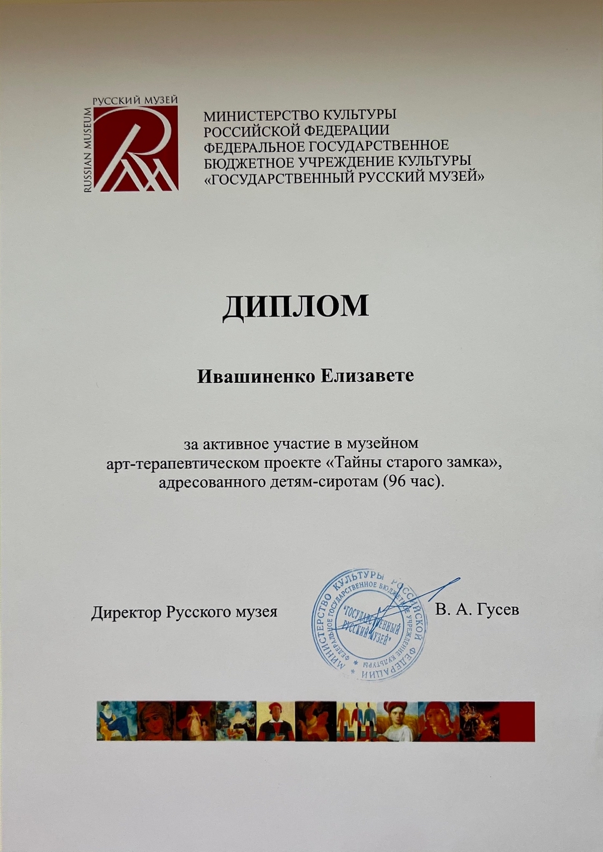 Диплом Государственного Русского музея. За участие в программе, адресованной детям-сиротам