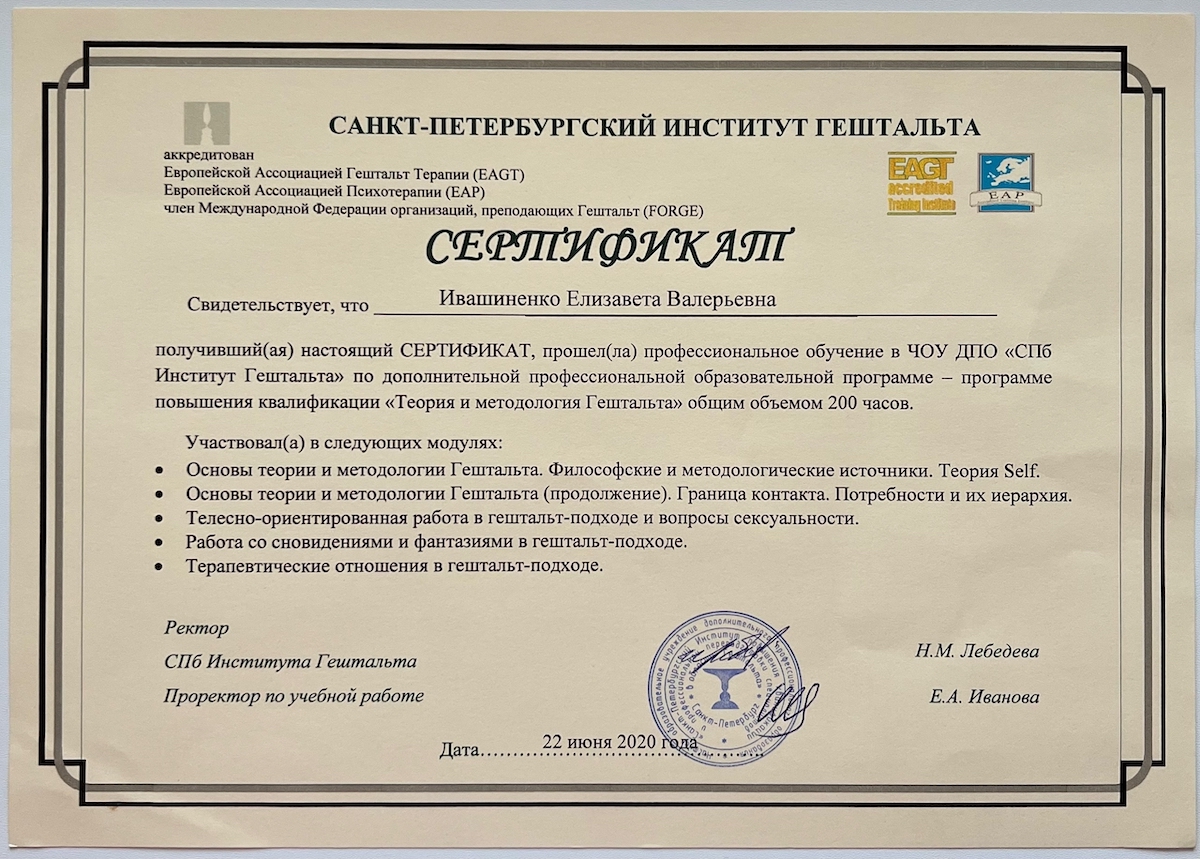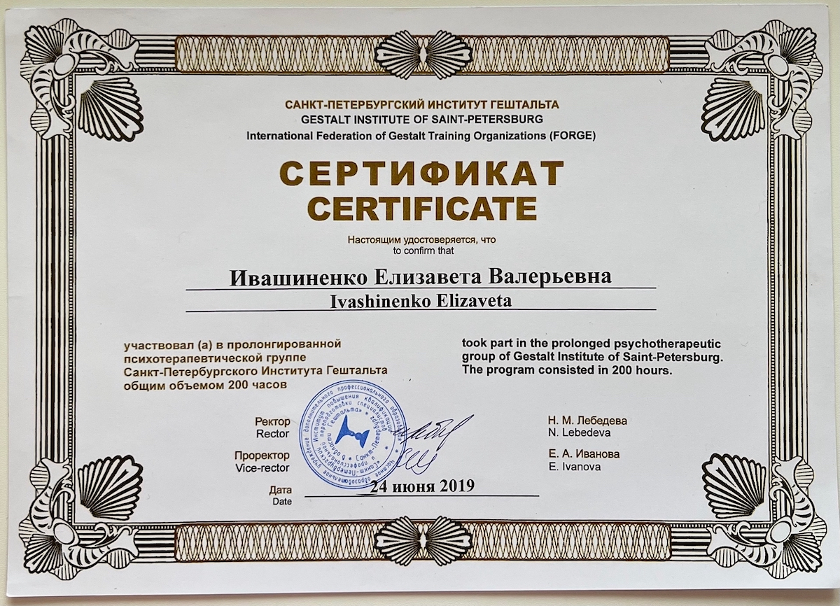 Сертификат Санкт-Петербургского института Гештальта, 2019