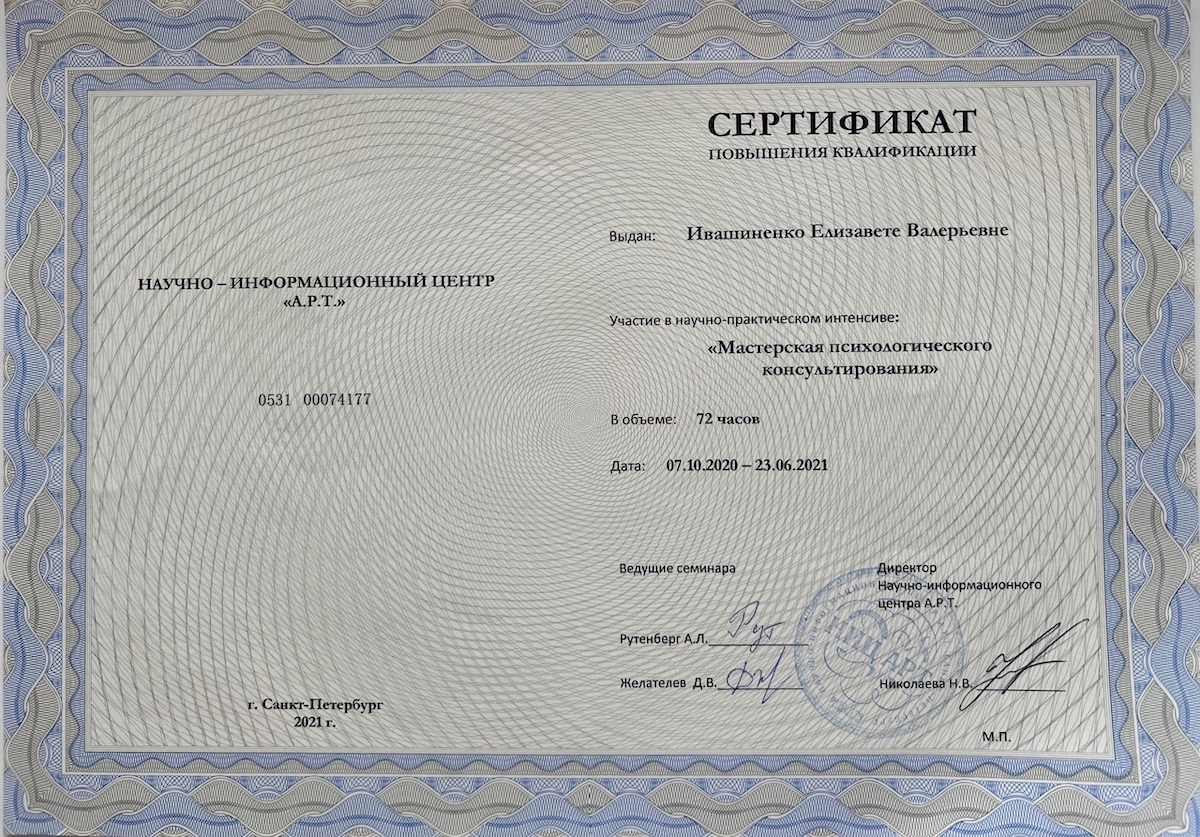 Сертификат центра А.Р.Т. Участие в интенсиве, 2021