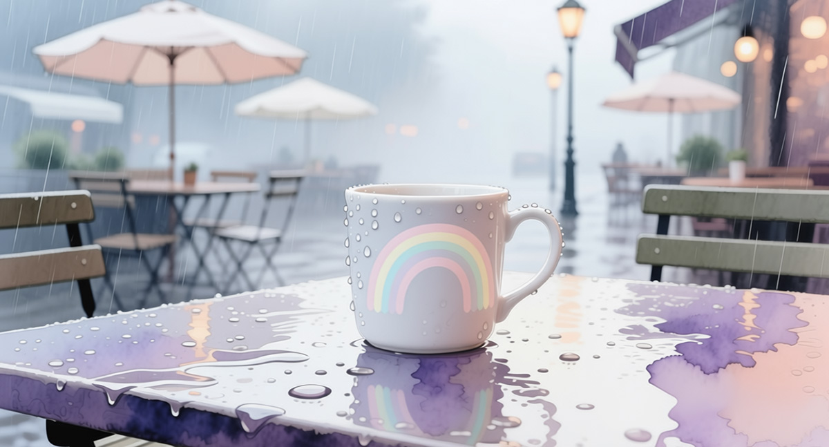 Мы отправились в кафе с панорамными окнами, из которых была видна вся улица. Дождь то стихал, то набирал силу, но солнце не сдавалось, и большая радуга, как добрая, широкая улыбка, всё это время оставалась на небе — яркая, недосягаемая.