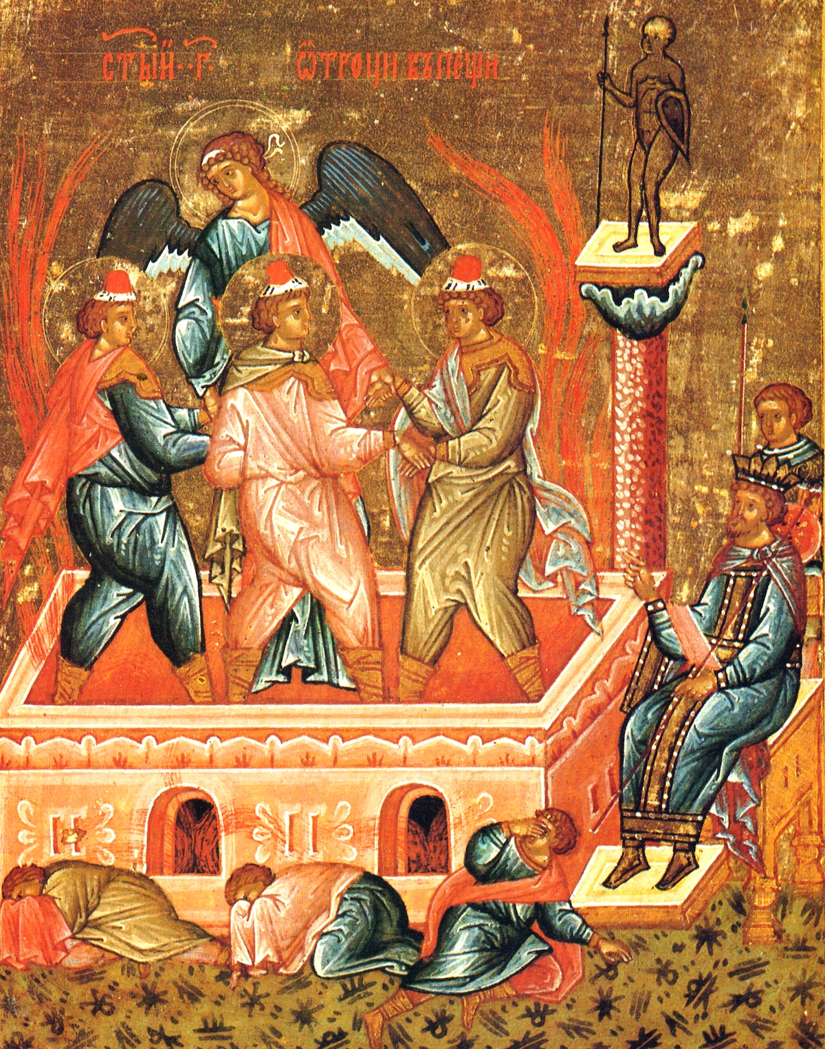 В иконописи сцена пребывания трех отроков в огненной печи — одна из самых выразительных ветхозаветных миниатюр. Трое отроков — Анания, Азария и Мисаил — стоят в раскалённой печи прямо и спокойно. Огонь изображается не как языки пламени, а как золотые или красные волны, на некоторых изображениях как бы сходящие вниз, чтобы показать, что огонь послушен Богу. На головах у юношей — венцы или нимбы, одежда их не обгоревшая. Вместе с ними обычно изображается четвертый персонаж — тот самый, подобный сыну Божию (Дан 3:25), которого царь Навуходоносор увидел в пламени. Иконописцы изображают его как ангела или как юношу в сияющем одеянии, редко с крестом в руке. В христианской традиции этот образ считается прообразом Христа — Сына Божия, который присутствует с людьми в испытаниях.
