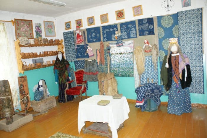 Самовары, сарафаны, прялки, туеса, ткани, деревянная посуда, расписные сундуки, которым сто лет, а может, и все двести, тяжелые чугунные утюги… Деревенский ткацкий станок ручной работы… И какие-нибудь совсем уж экзотические для городского жителя «жатки», «мятки», многоразличные инструменты плотника с невыговариваемыми именами.
