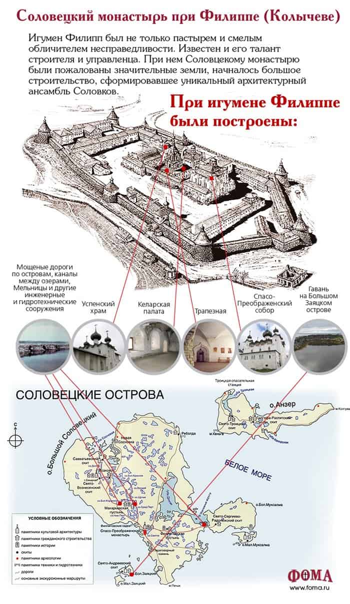 Игумен Филипп был не только пастырем и смелым обличителем несправедливости. Известен и его талант строителя и управленца. При нем Соловецкому монастырю были пожалованы значительные земли, началось большое строительство, сформировавшее уникальный ансамбль Соловков.