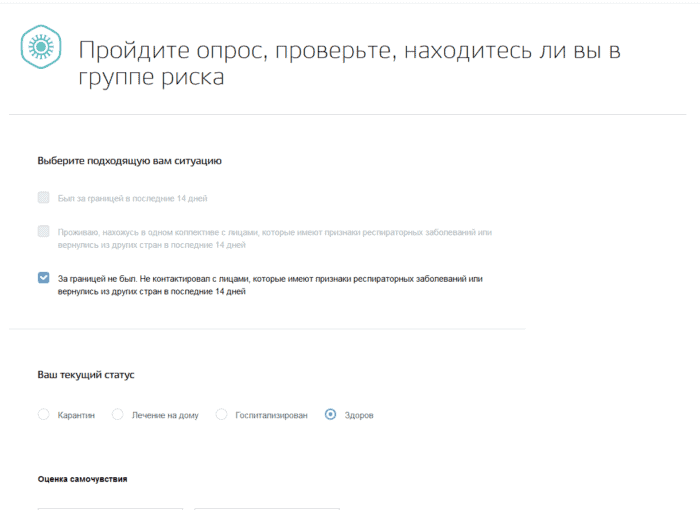 Функция, представляемая порталом «Госуслуги». Разработана при поддержке Минздрава России. Пользователю сайта предлагается опросник, в котором необходимо заполнить следующие данные: были ли Вы за границей в последние 14 дней, текущее положение (карантин, лечение на дому, отсутствие особого статуса), температура, пульс и жалобы на здоровье. Система сайта определяет, нужно ли пользователю предпринимать срочные меры или достаточно самоизоляциеи. Сервис доступен всем, кто зарегистрирован на Едином портале госуслуг.