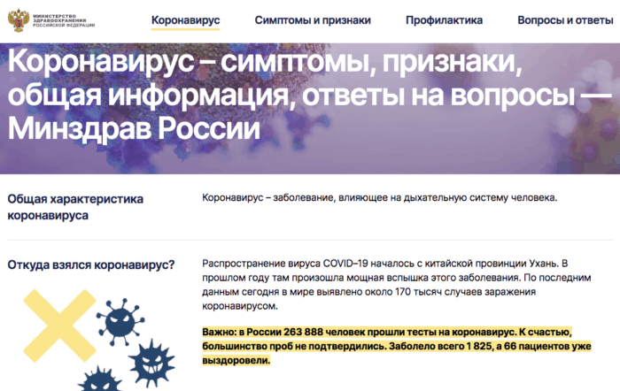 Подраздел сайта Минздрава РФ. На портале можно узнать о том, чем опасна коронавирусная инфекция, группах риска, способах передачи инфекции, как обезопасить себя от заболевания, а также правилах безопасности для медперсонала. Сайт предоставляет телефоны горячих линий, а в отдельном блоке указывается количество зарегистрированных случаев инфекции.