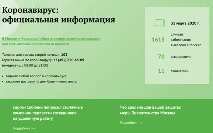 В столице действует проект «Covid-19». На сайте указаны актуальные горячие линии для жителей Москвы. Здесь же можно сообщить о своем возвращении из страны с высокой степенью распространения инфекции. Здесь же доступна подборка лекций, выставок и экскурсий доступных для онлайн-посещения.