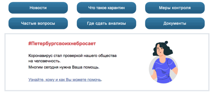 Жители Санкт-Петербурга могут следить за новостями об эпидемии через группу «Петербург против коронавируса» во «Вконтакте», telegram-канал «Оперштаб Петербург», а также через одноименную страницу на сервисе «Яндекс-чат». В режиме реального времени власти публикуют новости и рекомендации по коронавирусной инфекции. Здесь же публикуются постановления Правительства, а также опровергаются мифы, связанные с заболеванием.