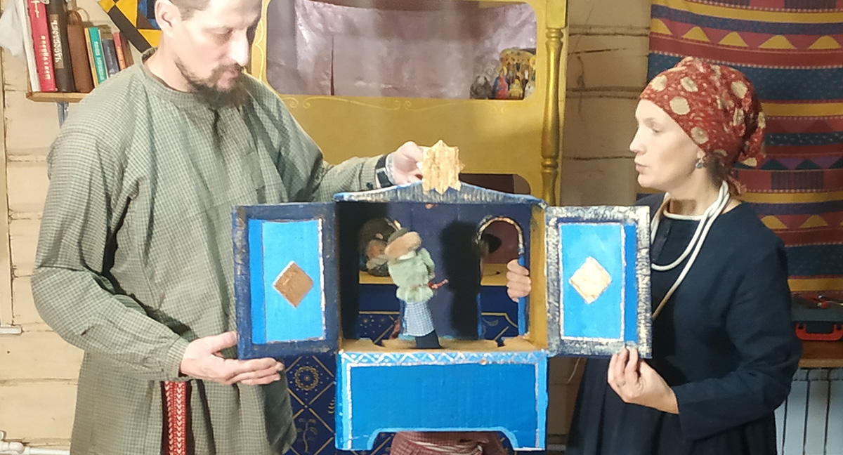 Вертеп хорошо закрывает двух кукловодов. Но если участников вертепа больше (есть другие участники, озвучивающие персонажей, есть люди с музыкальными инструментами, ведущий со сценарием), можно повесить дополнительный занавес, кулису, чтобы скрыть их от зрителей. А можно их вообще не закрывать. Мы часто привлекаем для озвучивания вертепного спектакля школьников или студентов. Озвучивать может любой человек, умеющий читать, потому что у него есть текст. Иногда мы сажаем детей-актеров, проговаривающих реплики и поющих песни, прямо рядом с вертепом, чтобы они сами могли смотреть представление. Это мистерия, здесь сплошь условности, и система Станиславского с погружением не нужна.