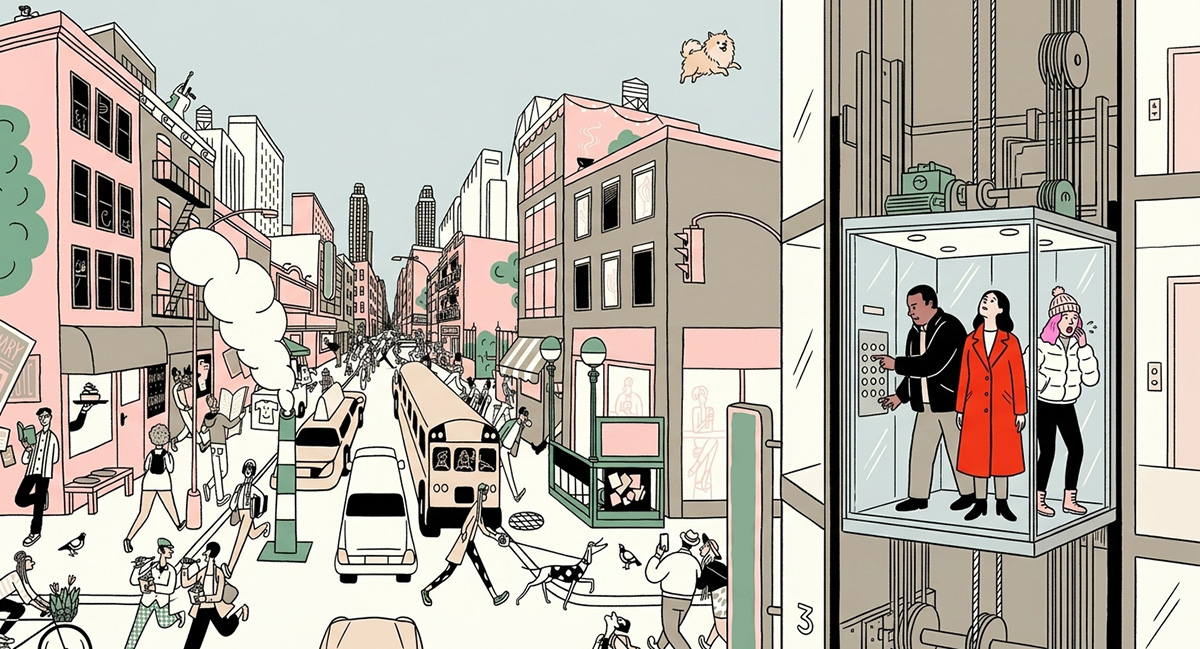 На одном квадратном метре мы собрались вчетвером. Я, мужик, который точно знает, что нужно делать, девушка, которая сразу же стала звонить своему «зайке», и тетя, которая в основном вздыхала и охала. Мужик сильно давил на все кнопки без исключения. Нажимал на каждую по несколько раз. Потом отдохнул и стал давить опять. Прошелся сначала по ним сверху вниз, а потом — снизу вверх. Пытался открыть дверь руками, все время повторял: «Мне бы сюда монтировочку».