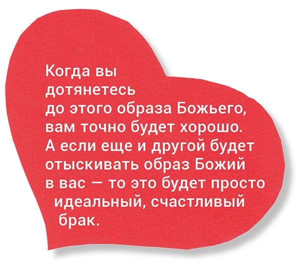 Первый: «Жди, молись, активно участвуй в церковной жизни, проси Бога. Когда надо будет, тогда встретишь. Если не встретишь, значит, не надо». И второй: «Да какая разница, на ком жениться или за кого выходить замуж, потому что в конечном итоге главное, чтобы были дети, а там стерпится — слюбится». На мой взгляд, оба эти совета не вполне работающие. Причем с аргументами в их пользу я скорее соглашусь, нежели буду спорить. Например, что касается второго подхода, то, безусловно, в глубине каждого человека скрыт образ Божий, и если мы ставим целью до него «докопаться», то по большому счету нет никакой разницы, на ком жениться и за кого выходить замуж. Потому что, когда вы дотянетесь до этого образа Божьего, вам точно будет хорошо. А если еще и другой будет отыскивать образ Божий в вас — то это будет просто идеальный, счастливый брак.