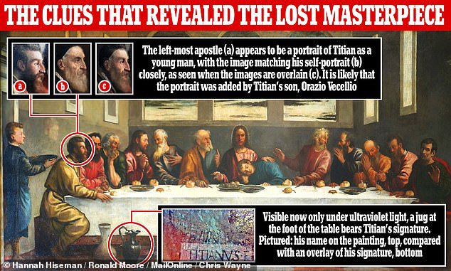 В частности, реставратор заметил, что лицо одного из персонажей картины, сидящего за столом, напоминает портрет молодого Тициана. В дальнейшем предположение эксперта подтвердилось, когда он с помощью программы для распознавания лиц сравнил лицо на полотне с автопортретом художника 1597 года.