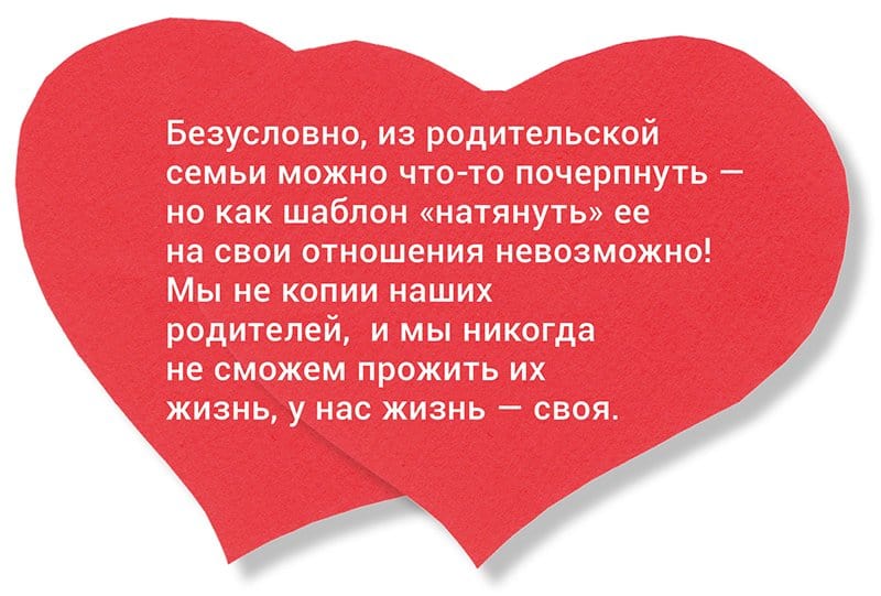 Чаще всего девушки приходят ко мне на прием с тем же аргументом, который приводит в письме читательница: «мама рассказывала…» У каждого из нас перед глазами есть конкретный образ семьи, в которой мы росли и воспитывались. И, к сожалению, очень многие люди пытаются этот конкретный образ «натянуть» на себя и на свою новообразованную семью. А потому зачастую мы с моими клиентами работаем именно на отказ от обязательности этого образа. То есть, безусловно, из родительской семьи можно что-то (а иногда и очень многое) почерпнуть — но как шаблон «натянуть» ее на свои отношения невозможно! Мы не копии наших родителей, и мы никогда не сможем прожить их жизнь, у нас жизнь — своя.
