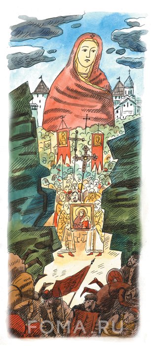 Сила духа и христианская вера псковичей могли творить чудеса. Однажды польский король Баторий осадил Псков. Когда он подошел к его стенам, то в восхищении сказал: «Кроме Парижа ничего подобного я не видел по размеру и красоте. Дай нам Бог взять этот город». Жители Пскова храбро защищались, но наконец истощились у них последние силы. И тогда они решили устроить крестный ход с иконой Богородицы по улице, которая вела к городской стене, на которую с особой яростью нападали враги. Они не знали, что поляки тайком прокопали к этой стене подземный ход и заложили под неё порох. В тот самый момент, когда крестный ход почти вышел к самой стене, раздался страшный взрыв, стену разметало, и польские солдаты с криками ворвались в город. Но столкнулись они не с воинами, а с крестным ходом, впереди которого несли икону Богородицы. И вдруг увидели, что это не икона, а сама Богородица явилась перед ними и требует, чтобы они убрались прочь из города. И хотя силы были неравные, поляки развернулись и в панике побежали прочь. Больше они Псков не штурмовали. Пытались взять город измором, но идти на его штурм отказывались, говоря, что Богородица им этого не велит.