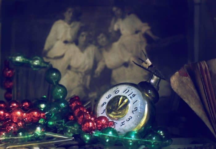 И еще посмотрите на будильник. Подобные часы, на которых «Двенадцать без пяти» многие фабрики елочных игрушек стали выпускать после выхода на экраны рязановского "Карнавала". В детстве я верила, что подарки под елкой появляются тогда, когда минутная стрелка на этих часах сравнивается с часовой, и часы показывают строго двенадцать. Надо только поймать этот момент, и тогда все узнаешь, поймешь и встретишься с Дедом Морозом.
