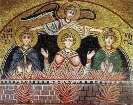 Воспитанные в почитании (истинного) Бога отроки, презрев нечестивого царя приказание, не испугались угрозы огня, но стоя среди пламени, воспели: «Благословен Ты, Бог отцов (наших)!»