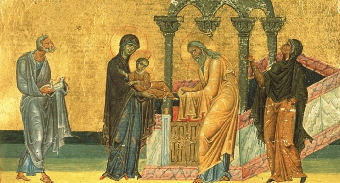 Святой Симеон благоговейно взял на руки Младенца Христа и сказал: Ныне отпущаеши раба Твоего, Владыко, по глаголу Твоему, с миром, ибо видели очи мои спасение Твое, которое Ты уготовал пред лицем всех людей. Свет к просвещению язычников и славу людей Твоих Израиля (Лк 2, 29—32). Благословив Марию и Иосифа, он добавил пророческое: Се, лежит Сей на падение и на восстание многих в Израиле и в предмет пререканий, - И Тебе Самой оружие пройдет душу, - да откроются помышления многих сердец (Лк 2, 22—35).
