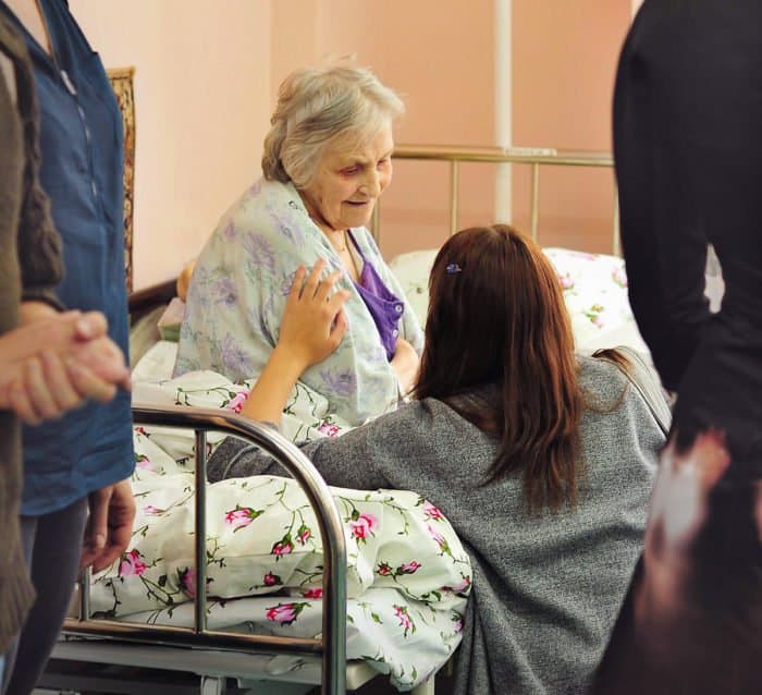 Как-то мы с тогда ещё будущим мужем отвозили подгузники бабушкам и дедушкам в деревню Карманово Смоленской области Там только открылось стационарное отделение, и бабушек было всего две. Я захожу в палату, поздравляю с праздником — это было накануне Крещения. И тут бабушка мне отвечает: «Ты ангел?..» — это мне потом муж рассказал, сама я тогда не расслышала. Не то чтобы она собиралась умирать, просто к ним никто не заходит, кроме персонала в халатах. А прийти просто так и сказать: «Здравствуйте! Как вас зовут? Как себя чувствуете? Где работали?» — что-то из области нереального. Периметр одиночества там очень четкий, кроме добровольцев его никто не разрывает.