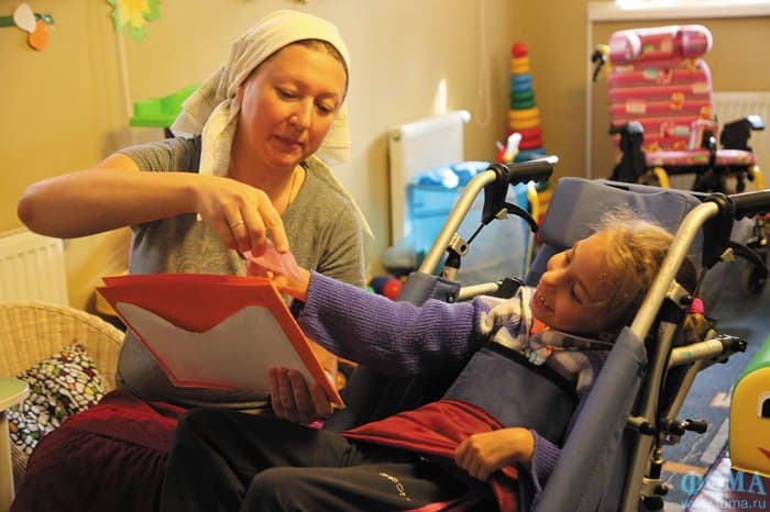 В обители есть Группа дневного пребывания для детей-инвалидов. Фактически это детский садик, куда детки с заболеваниями тяжелой степени и средней тяжести приходят дважды в неделю. Цель педагогов — во-первых, дать хоть немного отдохнуть родителям, а во-вторых, научить детей элементарным бытовым навыкам. Практика показывает, что в отрыве от родителей они усваивают их лучше.